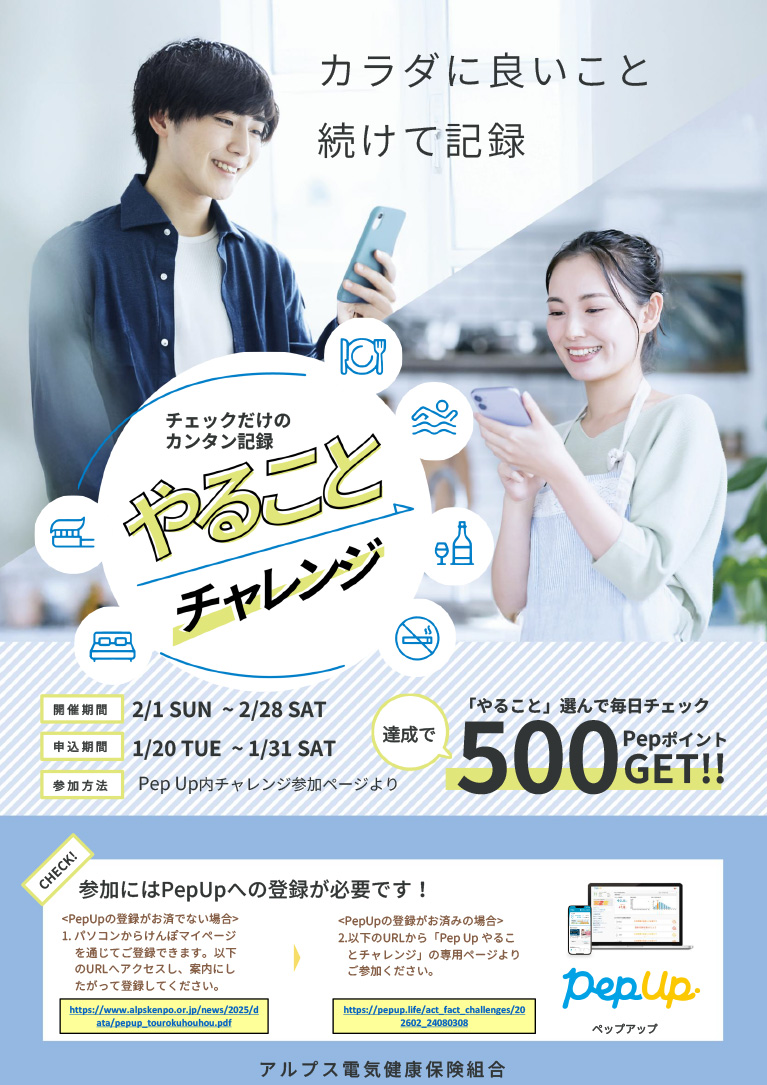 | 対象者 | Pep Upに登録したアルプス電気健康保険組合の被保険者 |